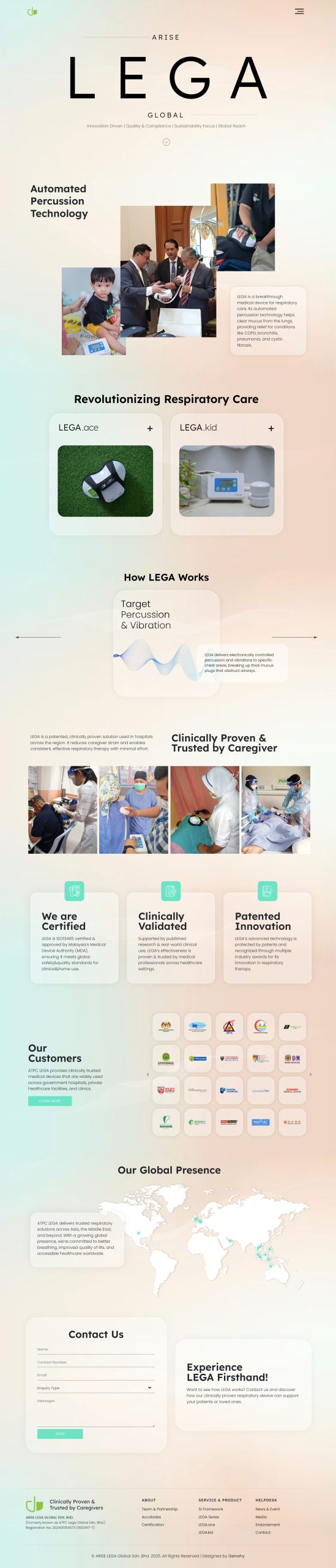 Arise (formerly ALGC) is a corporate profile website showcasing its product, endorsements, certifications, and gallery. A clean, light design with gradient backgrounds and glassmorphic effects creates a modern, transparent feel while enhancing user browsing.