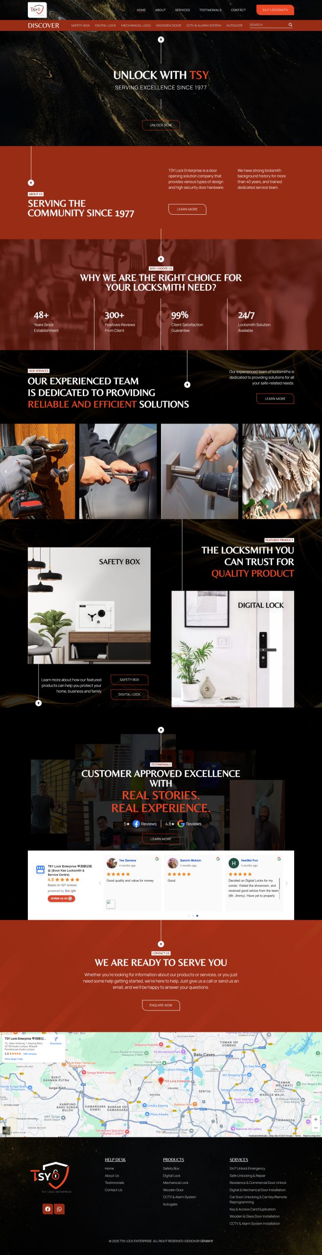 TSY Lock is a product-focused website showcasing its catalogue and services with a dark, luxurious theme. Red accents from the brand logo highlight key sections and buttons, while subtle lock icons reinforce its focus on safety boxes, smart locks, and unlocking services.